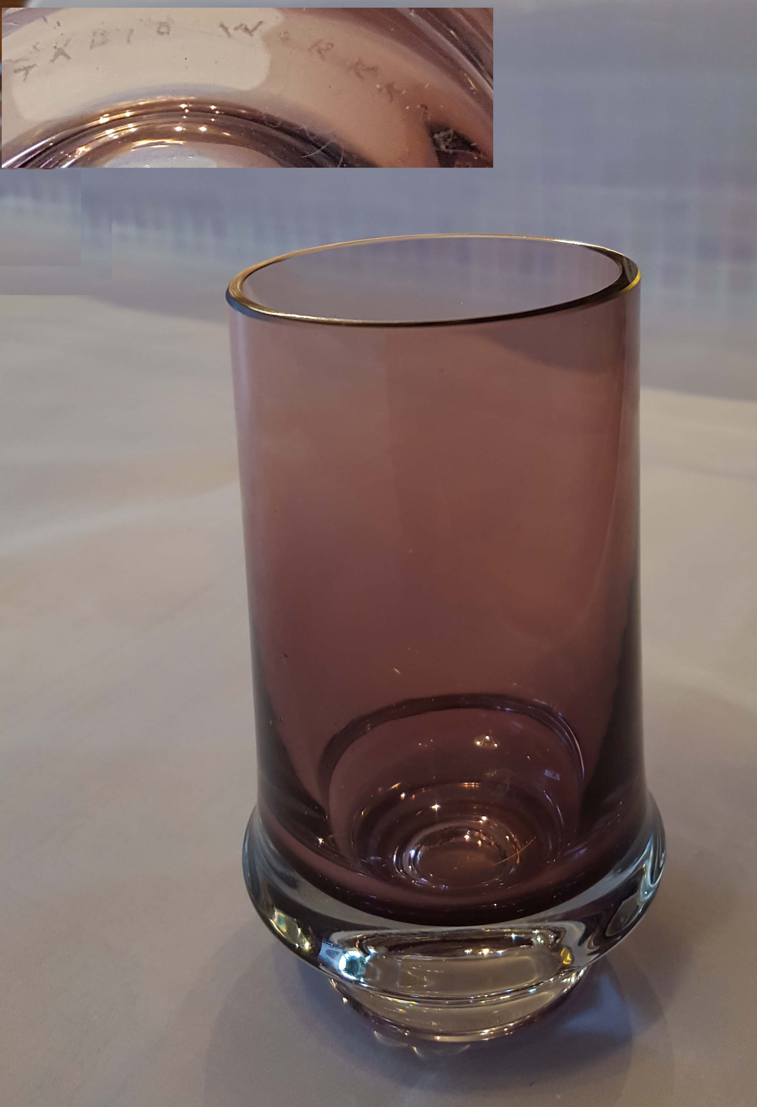 Korkeus 10,5 cm. Pieni kolo pohjareunassa. Näkyy kuvassa Oy:n yläpuolella.